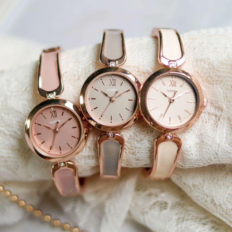 ニュアンスカラーのおしゃれなバングルウォッチ。着脱かんたんでアクセサリー感覚でつけられます。