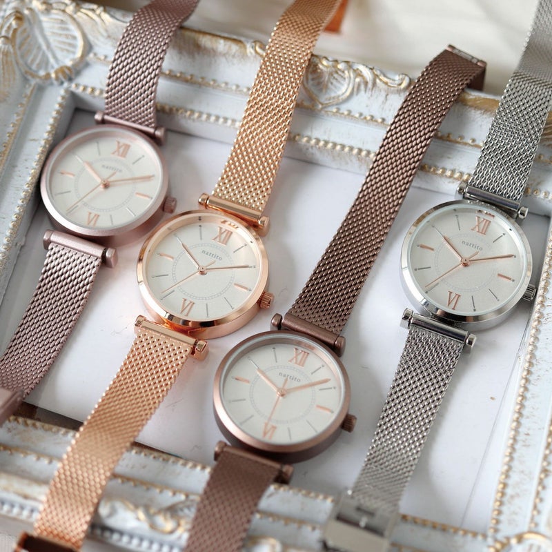 肌に馴染むピンクとブラウンのカラーが新しいメッシュベルトウォッチ。 バックルは2段階留めで外れてしまう心配がありません。 ※スライドギフトボックス使用不可