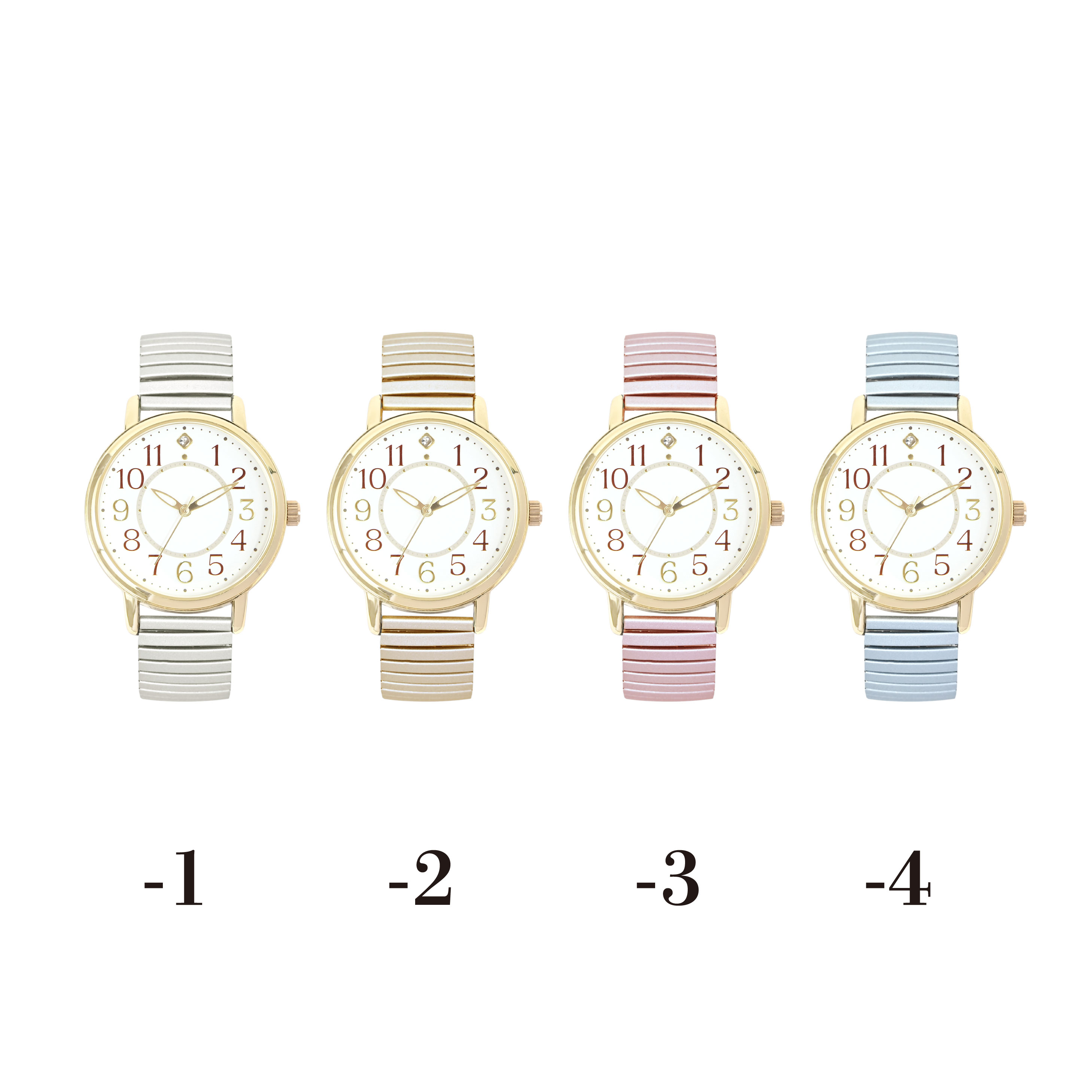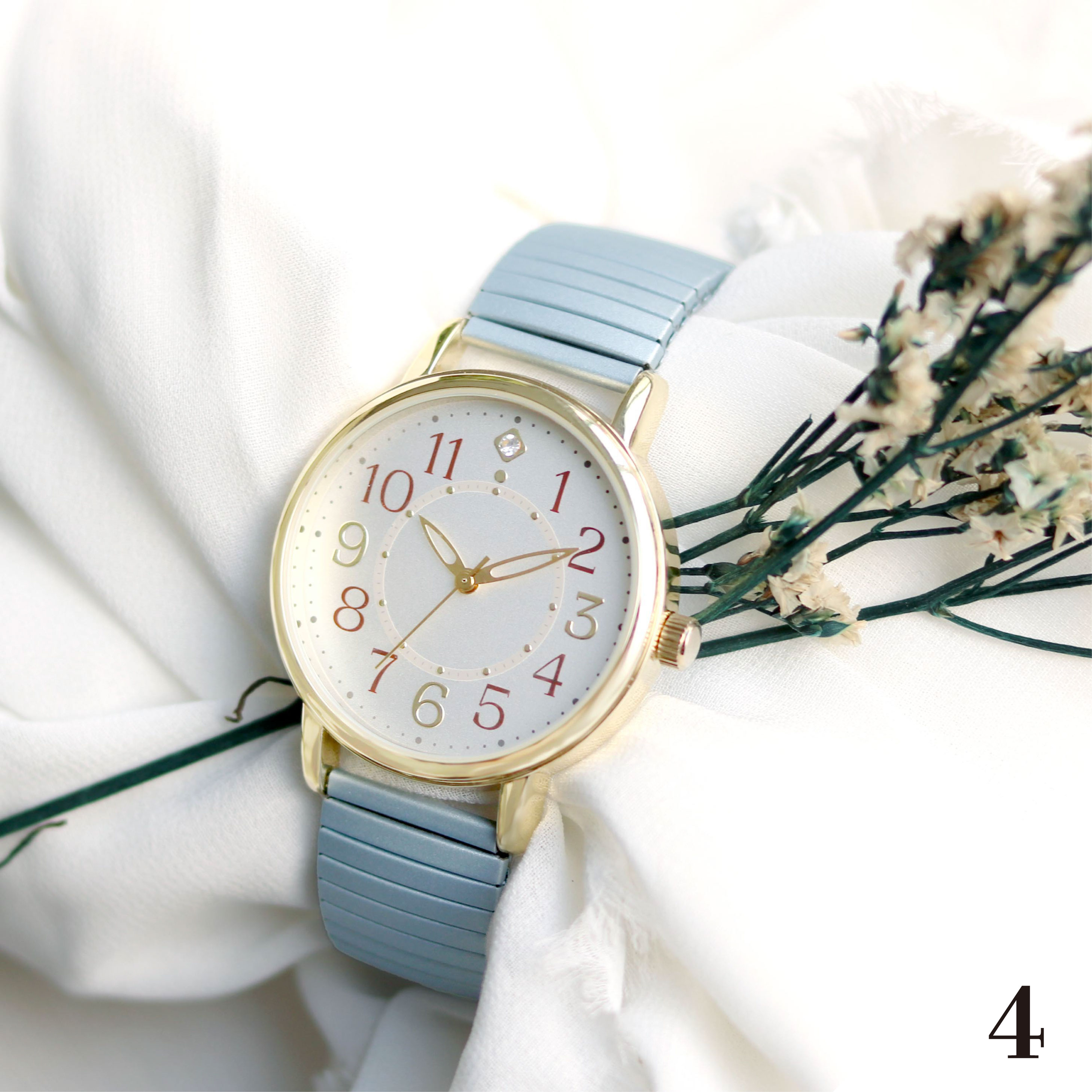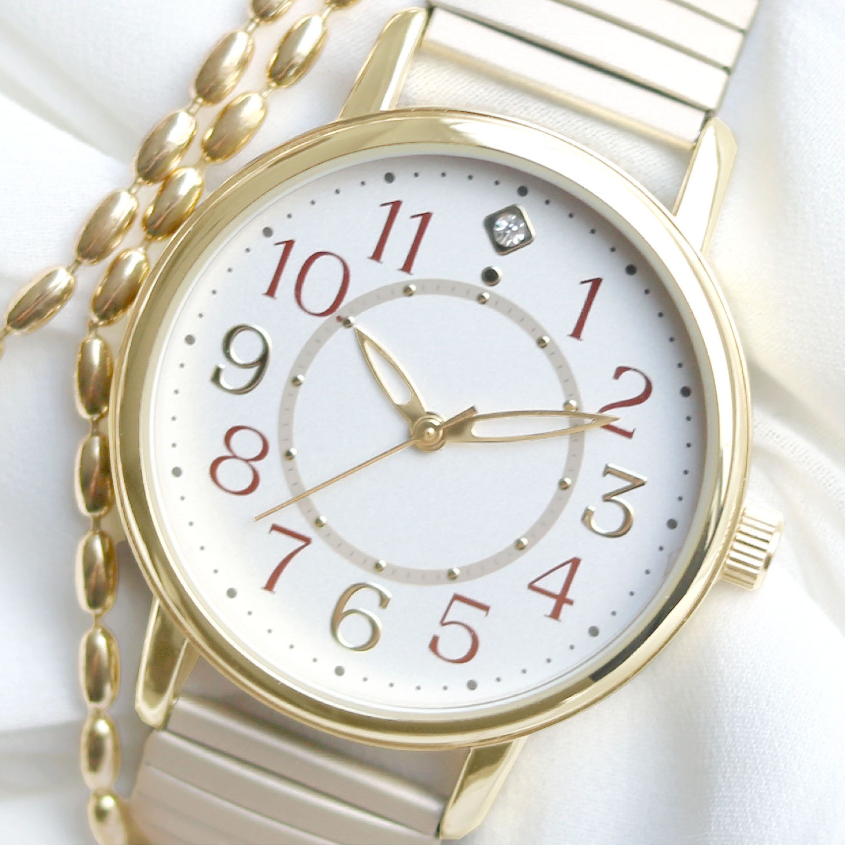 すっきり見やすい大き目文字盤!つけやすいじゃばらタイプの腕時計