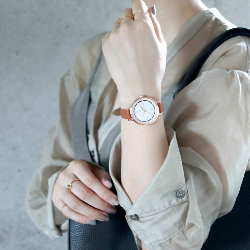 シンプルで大人っぽいデザイン。後ろが透けて見える文字盤がポイントです。