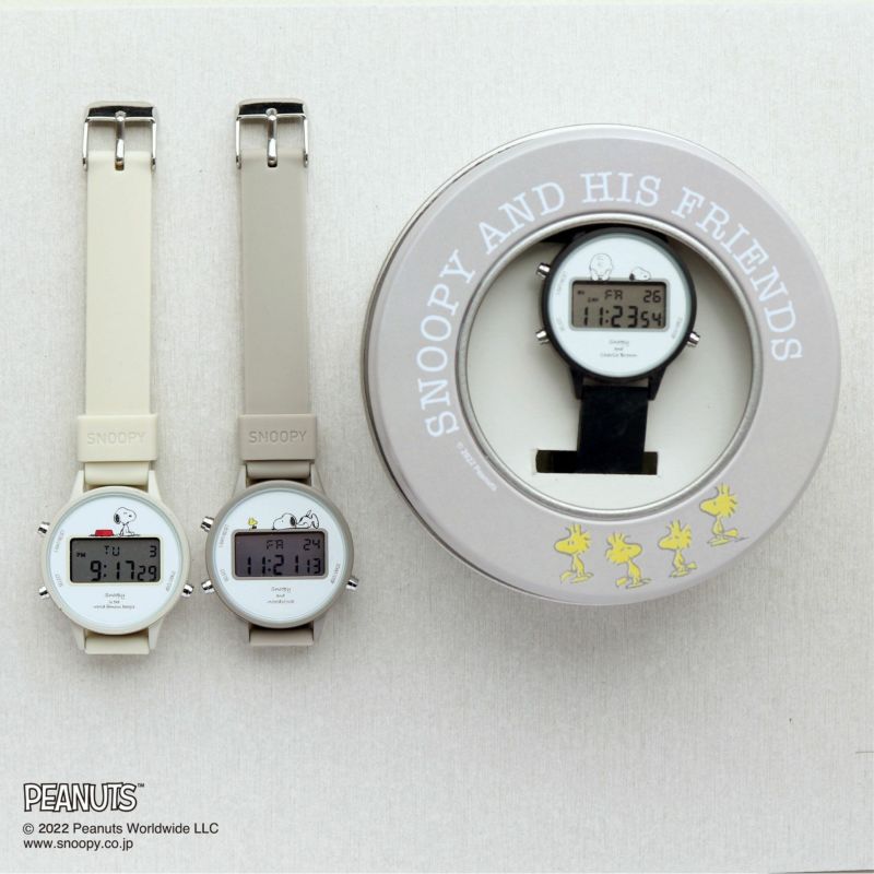 ピーナッツ・ギャングがプリントされたカジュアルなデジタル時計。缶BOXパッケージ付き
