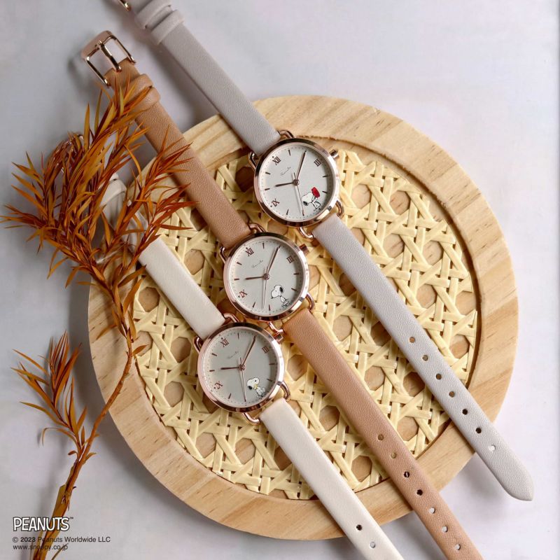 ベルト幅が細く、付け心地がすっきりしている腕時計 かわいいスヌーピーの絵柄の文字盤が特徴です。